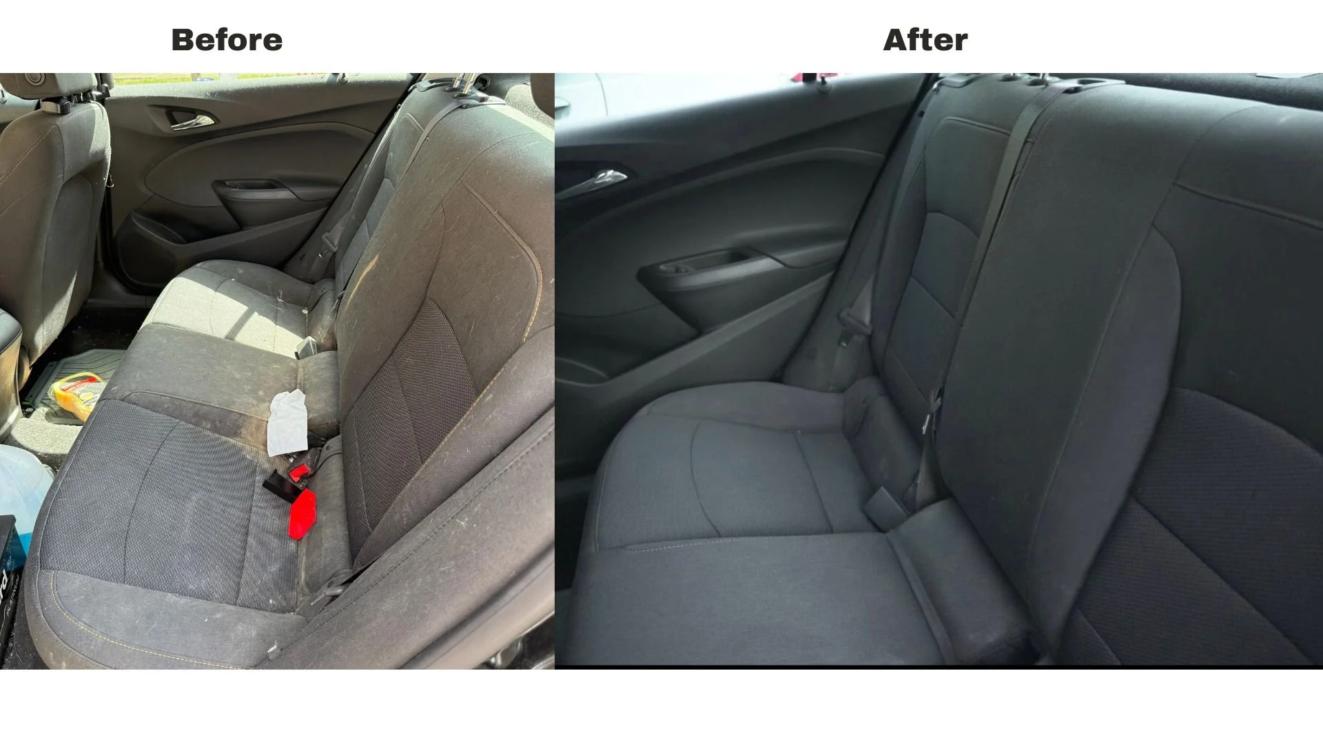 This is an a example of a detail done in the past, using our removal strategies, we were able to succesfully extract all of the stains in this car. ( Stains like these require additional time to treat and may incur higher charges at our discretion and we deserve the right to decline service. )